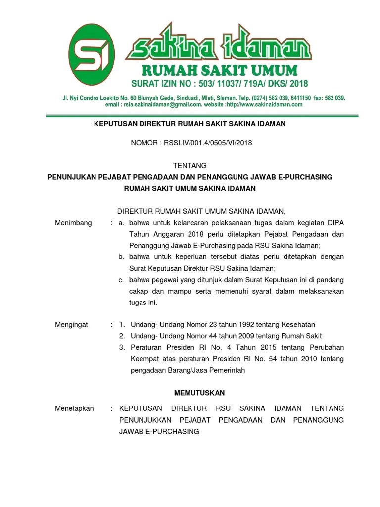 Format keputusan pengguna anggaran tentang penetapan pejabat pengadaan (pp) tanpa terikat tahun anggaran.